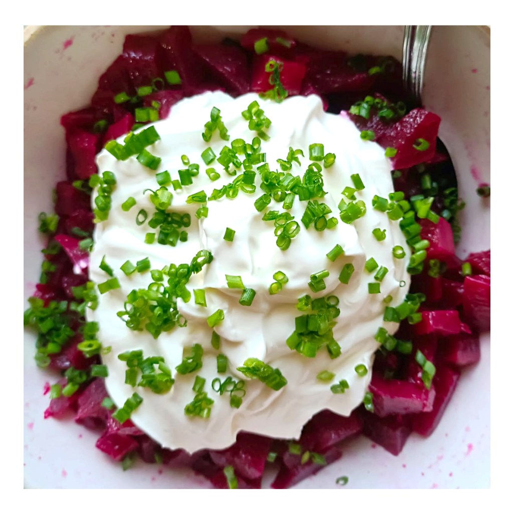 Salade de betteraves cuites, assaisonnée avec la sauce froide à base de yaourt, parsemée de ciboulettes 🌱